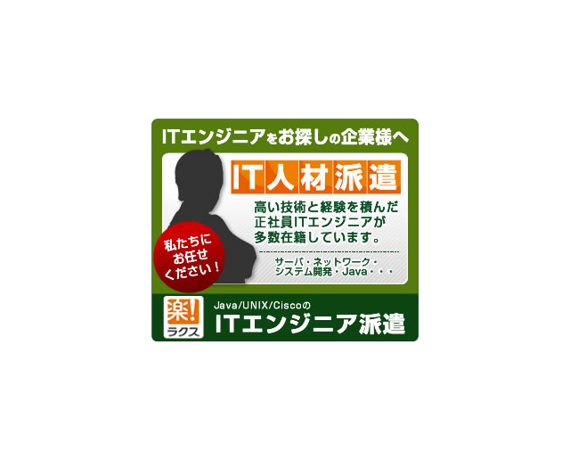 株式会社ラクス ITエンジニア派遣サービスのリスティング広告用 バナー制作。 Googleのプレイスメント広告・リマーケティング広告(Adwords)を利用し、新規顧客の獲得・ブランド認知を目的に制作しました。 企業としての信頼感、ITエンジニア派遣とひと目でわかるデザインを心がけました。
