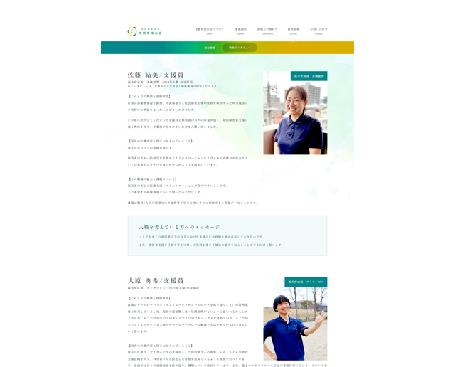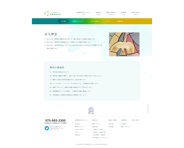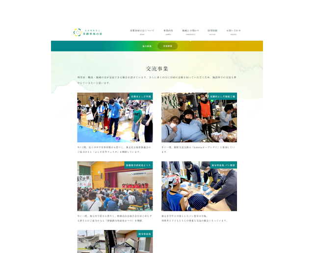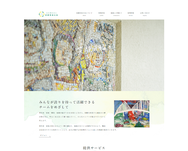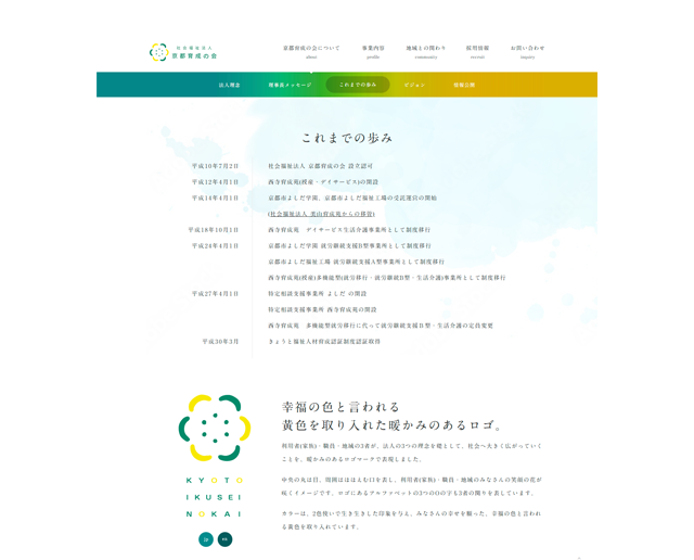 京都育成の会https://kyoto-ikuseinokai.com/ 担当 企画 デザイン HTML/CSS 京都にある社会福祉法人 京都育成の会のwebサイト。利用者・職員・地域の3者が社会へ大きく広がっていくようにあたたかみのあるデザインを目指しました。同時にロゴマークも作成しました。